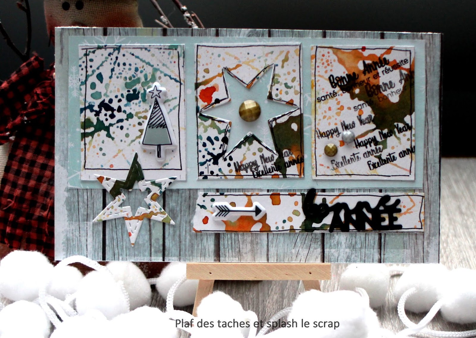 Pour découper de l'alu à la Big shot, il suffit de le coller sur un bout de cartonnette ou cardstock, c'est simple comme bonjour. Pour ma carte, j'ai eu envie de kraft et de gesso, avec un peu de papier livre en transparence, le rose s'y associe particulièrement bien. J'ai passé de l'Izink rosée en pad au cut'n dry et sur le bas de la carte j'ai fait quelques coulures en mélangeant l'encre Izink avec un gelato rose et de l'eau. Quelques tamponnades noires, dont mon nouveau tampon de AALL Create (les taches noires alignées), puis une découpe structure en rose. J'ai centré mon titre et l'ai doté d'une ampoule en alu, également découpée au die de la fée du Scrap. Pour renforcer l'effet mixed média, j'ai coupé en deux une étiquette festonnée de la Cie des Elfes tamponnée en noir sur du kraft, détourée et collée en bas à gauche. Une autre étiquette de la série crazy coutures en haut à droite et des crazy coutures à deux endroits sur le bord souligné au feutre noir. Et juste quelques oeillets pour finir. Et là en publiant, je me rends compte que quelques étoiles noires auraient été chouette, j'en rajouterai peut-être, mais là je suis au taquet.